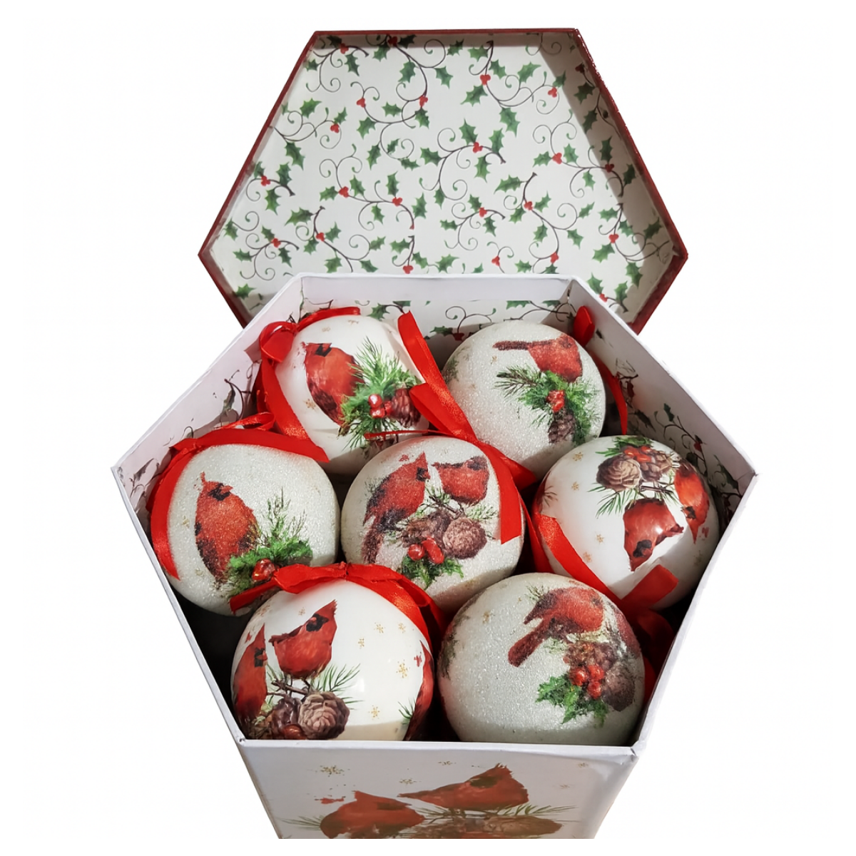 Este kit com 14 bolas natalinas premium estampadas com cardeais acompanha uma caixa decorada hexagonal, perfeita tanto para presentear quanto para guardar o conjunto com estilo.