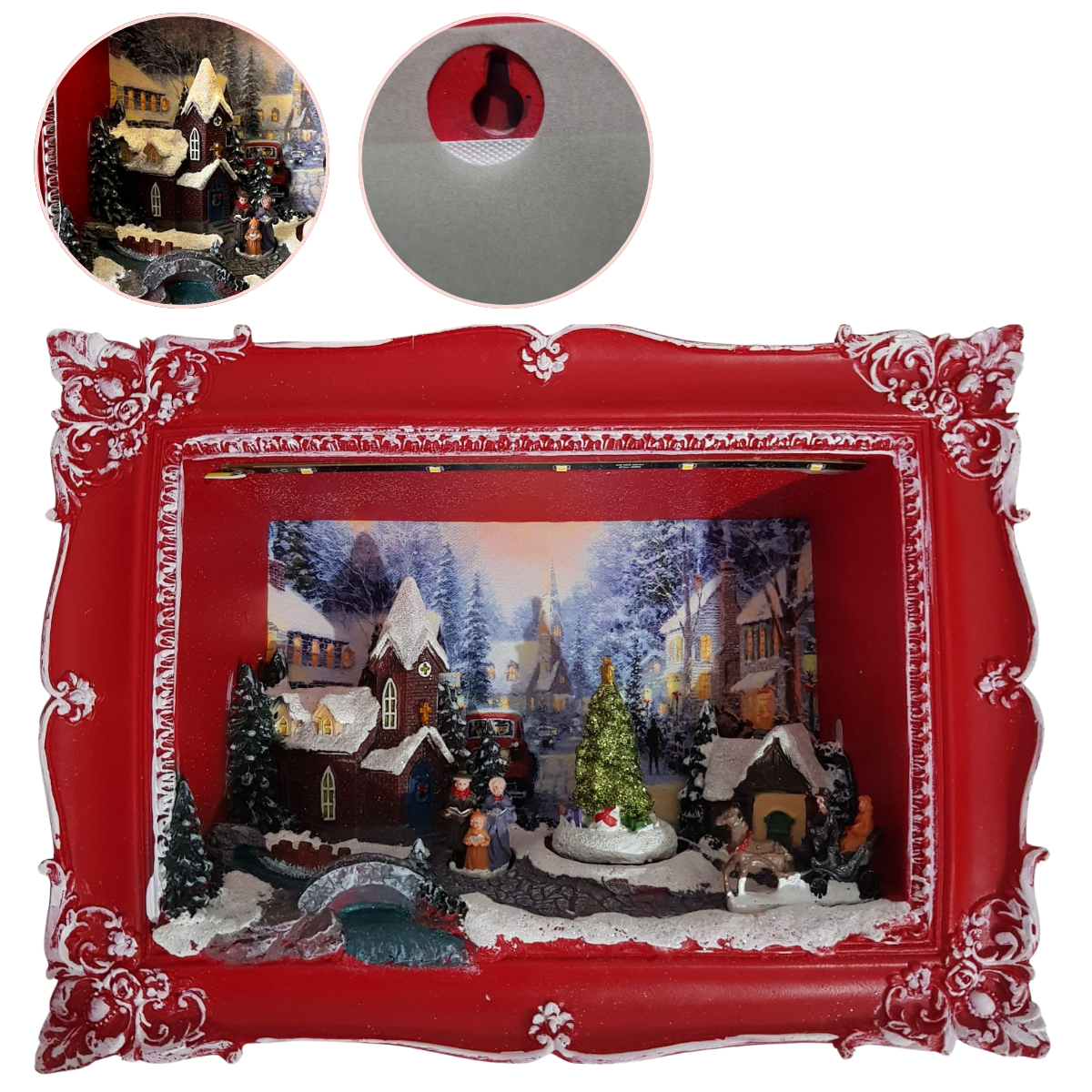 Com moldura vintage vermelha envelhecida, detalhes em alto relevo e um cenário em 3D que simula uma vila de Natal na neve com luzes, personagens, casinhas e árvore natalina giratória, ele transmite encanto, acolhimento e elegância.