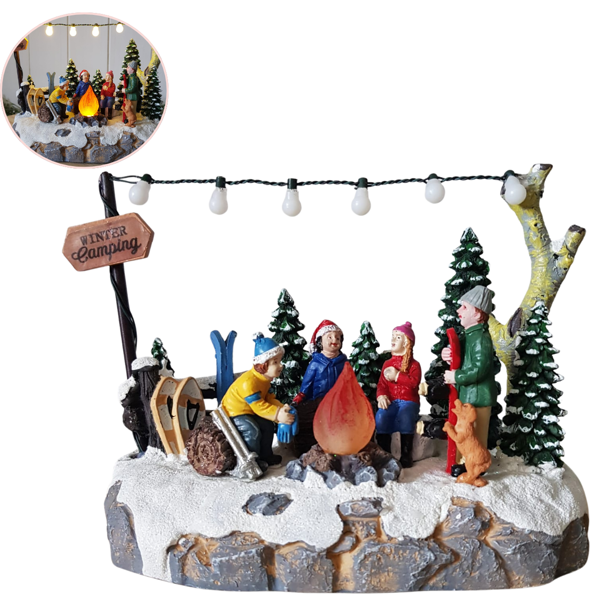 Transforme sua decoração natalina com este encantador cenário Winter Camping. Um grupo de pessoas se reúne ao redor de uma fogueira que acende com brilho realista, criando uma atmosfera acolhedora de inverno. As luzes do varal iluminam toda a cena, trazendo vida e magia para sua Vila de Natal.